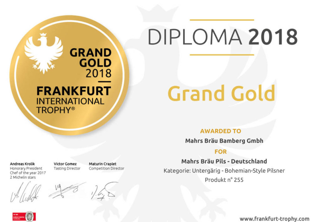 die besten Biere ihrer Klasse zu ehren. Und Amateure und Experten sind sich einig: Die Biere aus der Wunderburg gehören dazu! Gleich drei Auszeichnungen wurden der Mahrs Bräu im historischen Festsaal des Gesellschaftshauses Palmengarten in Frankfurt verliehen. Das kalt gehopfte Mahrs Bräu Pils holte in der Kategorie „Untergärig – Bohemian Style Pilsner“ die bestmögliche Auszeichnung, nämlich „Grand Gold“. Das leichte „Sommerpils“ wurde mit Silber in der Kategorie „Untergärig – Leichtbier“ ausgezeichnet und auch unser ungespundetes „U“ räumte Silber ab – und zwar in der Kategorie „Untergärig – German-Style Kellerbier“.