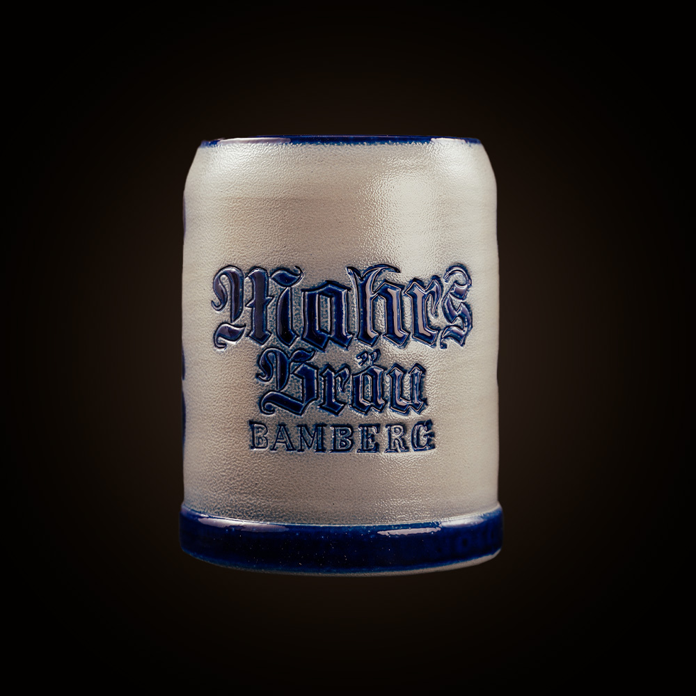 So edel wie der Inhalt selbst: Der Mahrs Bräu Steinzeugkrug mit handgemaltem Dekor und Mahrs Bräu Logo – salzglasiert & geblaut und in traditionellem Kobaltblau aus dem Hause Girmscheid in der Eifel.