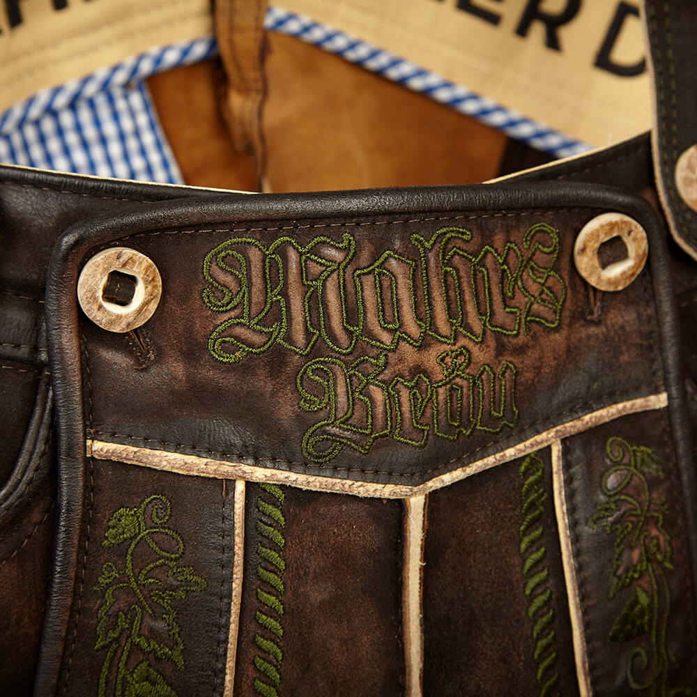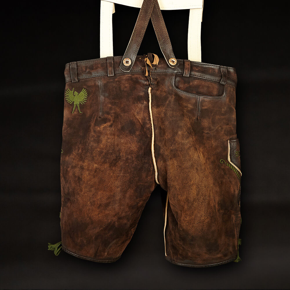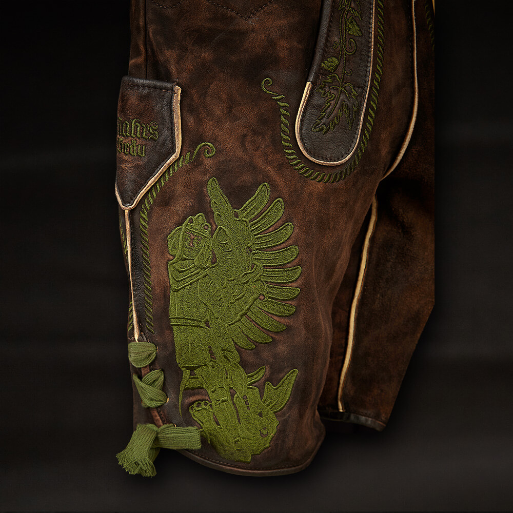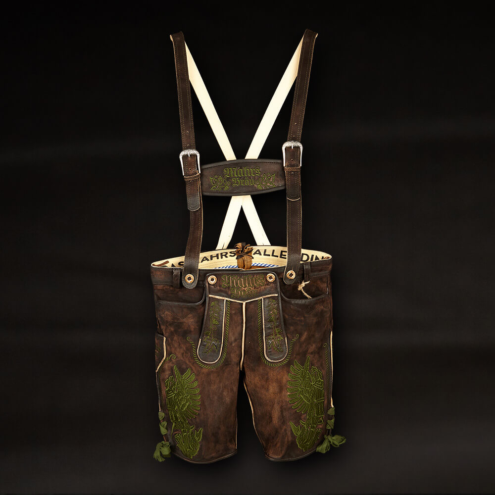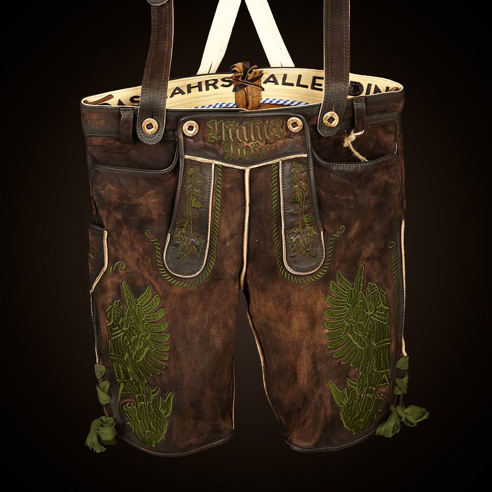 A true showpiece and crowning jewel for every die-hard Mahr’s traditionalist; in this beer-fest-tested uniform, you are the undisputed top dog at every keg tapping and drink downing. The leather pants are intricately embroidered and made from used-look tanned, wild buck (European mountain goat) leather. Clearly, because we only tolerate your